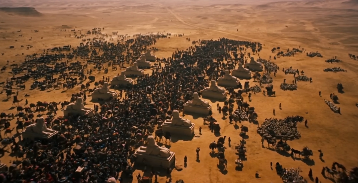 El encuadre convierte la arena en un tablero ritual. Las esfinges, alineadas con una regularidad casi militar, funcionan como columnas simbólicas del poder egipcio, fósiles de una civilización que se cree eterna. Entre ellas, el pueblo avanza, se agolpa, se comprime. El movimiento no es libre: está canalizado, guiado, sometido por la arquitectura del plano. El cine clásico entendía que la puesta en escena no es decoración, sino pensamiento visual.