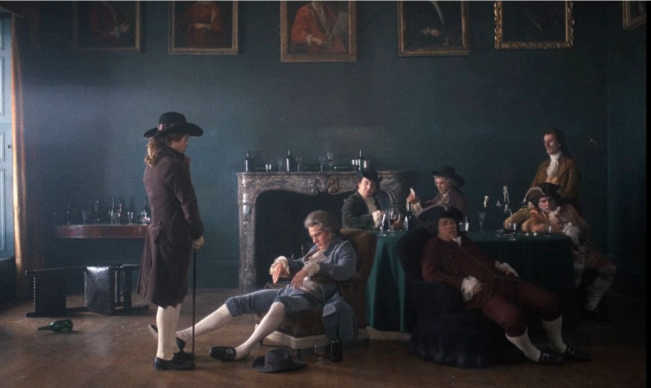 La composición es rigurosamente frontal, casi pictórica, como si Kubrick hubiera detenido la cámara frente a un lienzo de Hogarth o Gainsborough para obligarnos a mirar sin parpadear. La estancia se organiza en capas horizontales de poder: en lo alto, los retratos, testigos mudos y severos de una nobleza heredada; en el centro, la chimenea, símbolo del hogar convertido en altar profano; en la base, los cuerpos abandonados, desparramados, vencidos por el tedio y el alcohol. La historia pesa literalmente sobre ellos.